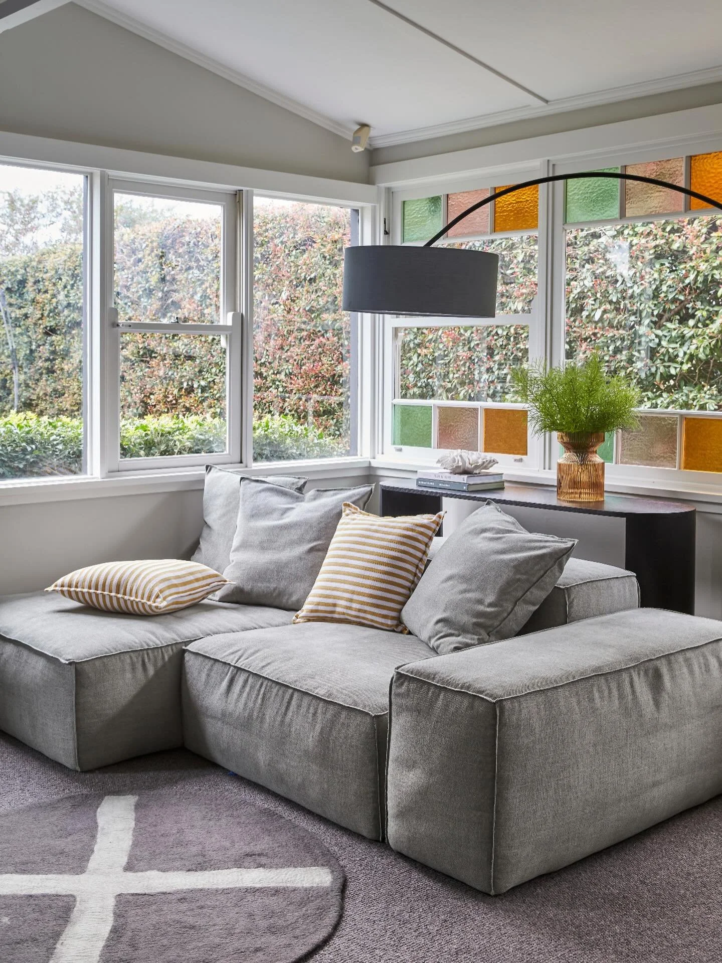 Sliding window panels, Vitrocsa. Wilfred armchair, Jardan. Fat lounge chair by Tom Dixon, Manyara Home. Oxo coffee table, Mark Tuckey. Laurel side table by Luca Nichetto, Spence & Lyda. Agra rug, Armadillo. Theatre Types sculpture by Scott McNeil (on coffee table), Curatorial+Co.